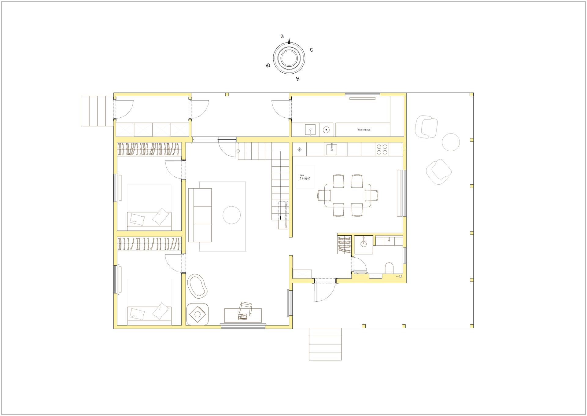 Дом хотели использовать для некруглогодичного отдыха всей семьёй из 6-ти человек с друзьями. Важно было разместить 5 спален, сделать 2 санузла, небольшой кабинет, зоны для совместного времяпрепровождения, отдельную кладовую и котельную.